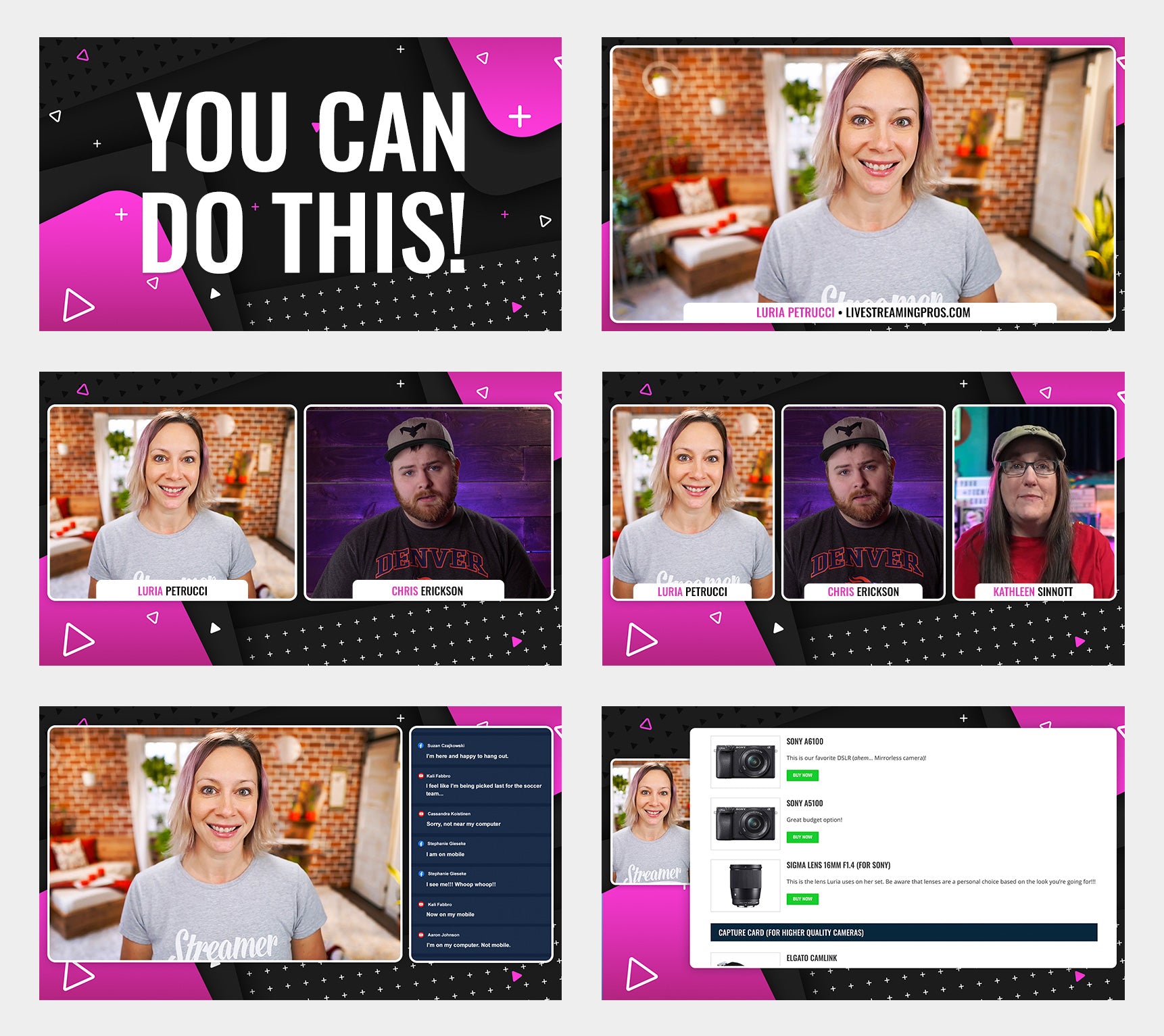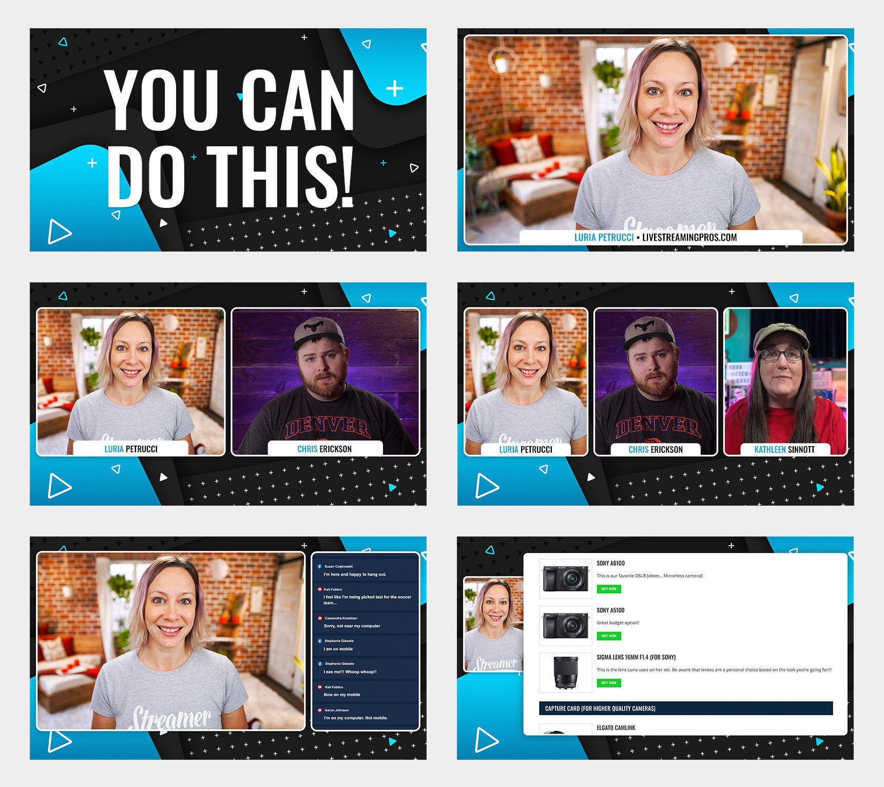 The overlays can be used as they are, but many of them include space where you can add logos, images, text, tickers, or widgets. All of the interview layouts come with versions with and without spaces for host/guest names.